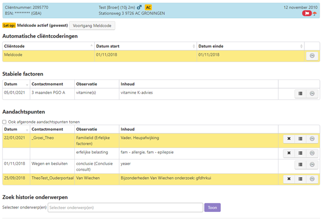 Conclusies kunnen niet worden afgesloten. Aandachtspunten worden gegroepeerd per contactmoment, waarbij per contactmoment de conclusie van dit consult bovenaan staat en observaties vervolgens alfabetisch worden getoond. Het meest recente contactmoment staat bovenaan.