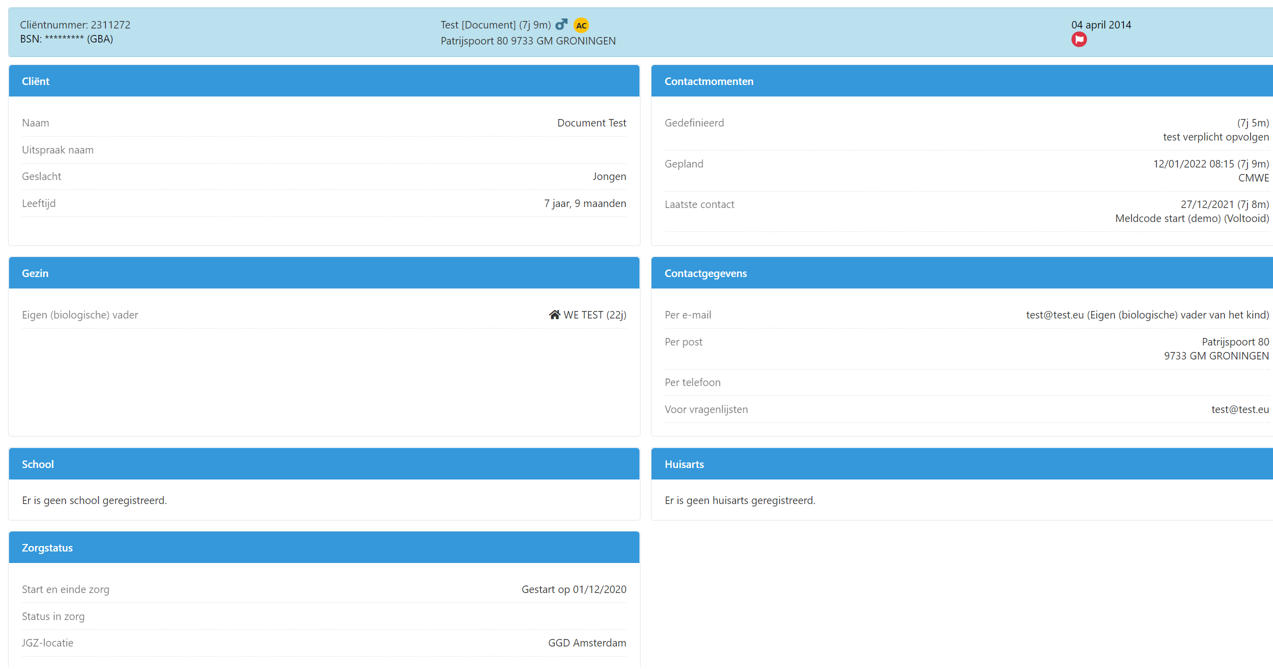 Op de cliëntkaart worden de gegevens getoond die een gebruiker snel wil kunnen raadplegen zonder in andere schermen te hoeven zoeken. De cliëntkaart is opgedeeld in zes onderwerpen nl Cliënt, Gezin, School, Contactmomenten, Communicatie en Zorgstatus. Op de cliëntkaart wordt alleen informatie getoond, er kan niets worden gewijzigd. Afhankelijk van permissies worden tegels getoond of verborgen.