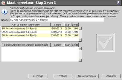 Door op de knop [Voltooi] te klikken worden de spreekuren uit het vak ‘Aan te maken spreekuren’ daadwerkelijk aangemaakt en zichtbaar in agenda’s van betrokken deelnemers en het receptiescherm