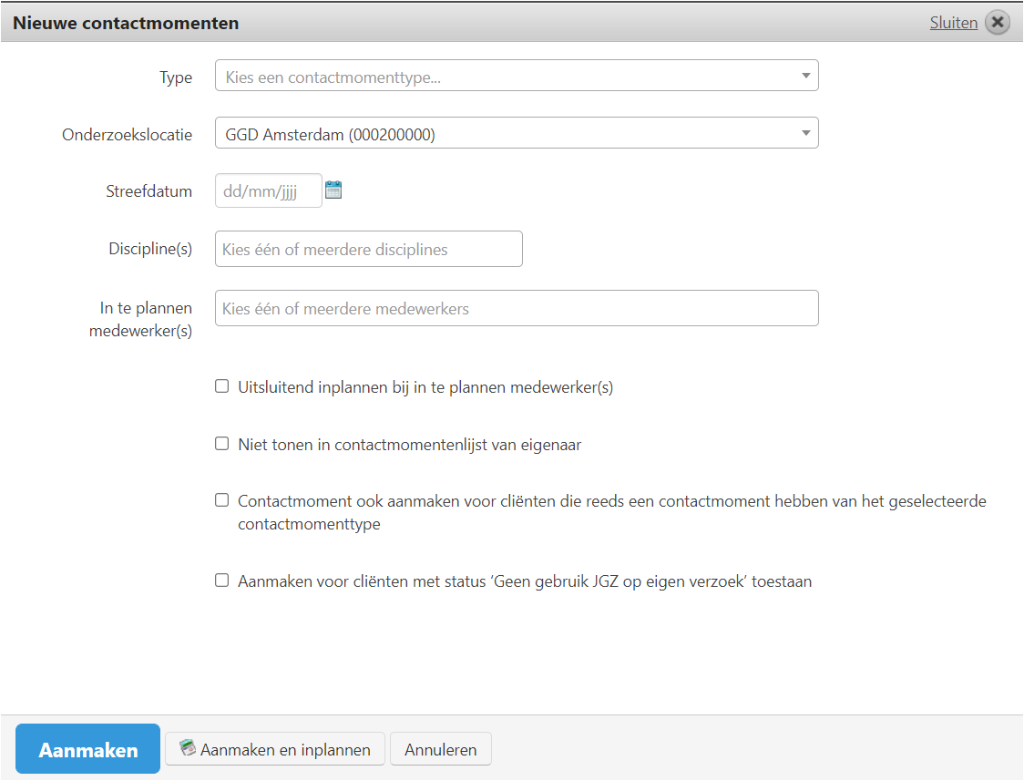 Nadat je op ‘Nieuw contactmoment’ hebt geklikt verschijnt onderstaand scherm. De volgende gegevens zijn verplicht: type contactmoment, onderzoek locatie en streefdatum.