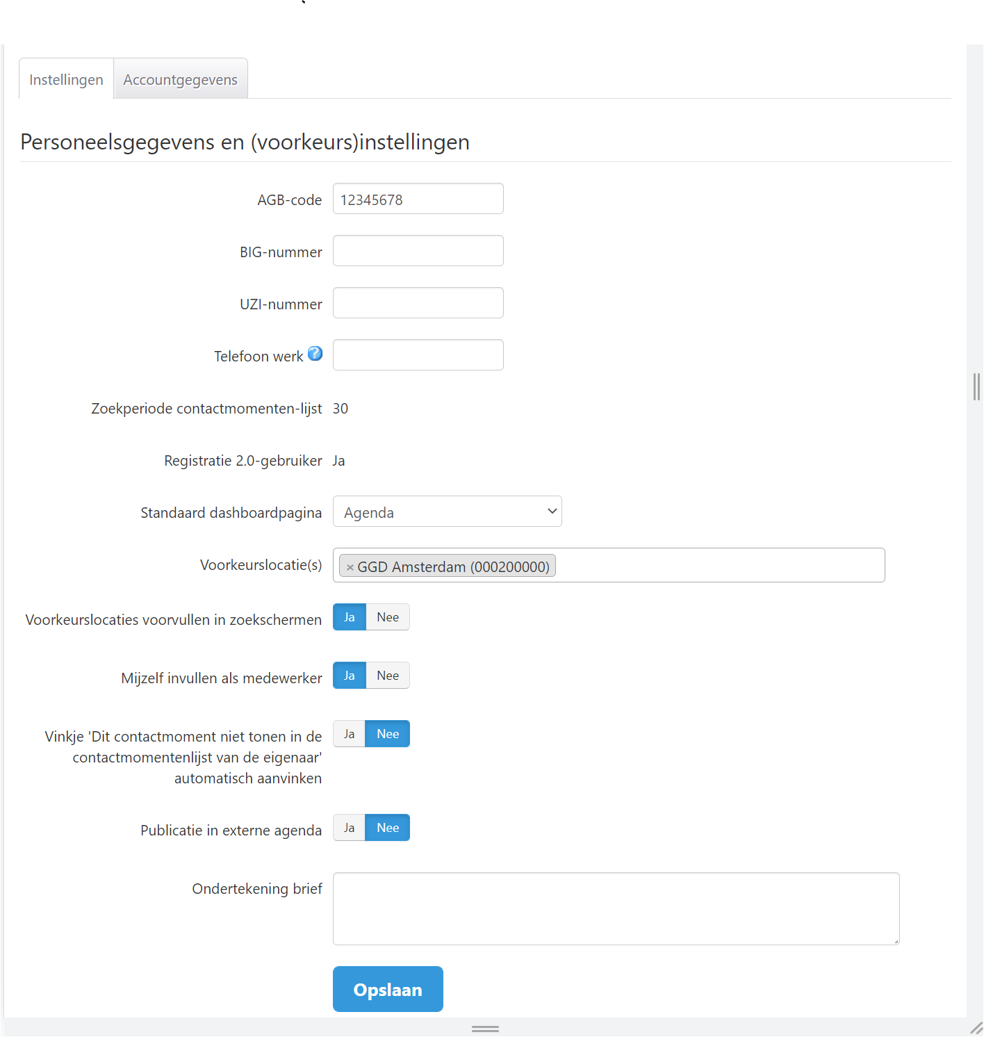 Het veld Standaard dashboardtabblad staat default op ’Agenda’. Dit veld bepaalt welk tabblad wordt
