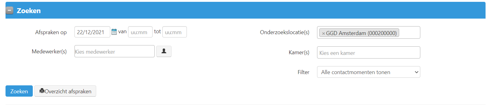 Er zijn vier zoekvelden: ‘Onderzoekslocatie(s)’, ‘Medewerker’, ‘Afspraken op’ en een filter.