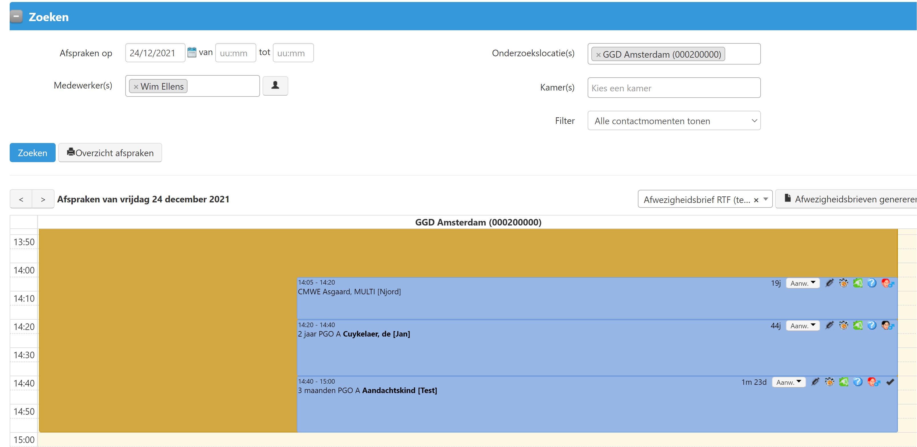De inhoud van dit scherm is een agendaweergave met de afspraken van één of meer locaties voor één dag. Contactmomenten die niet in een spreekuur zijn ingepland worden ook getoond.