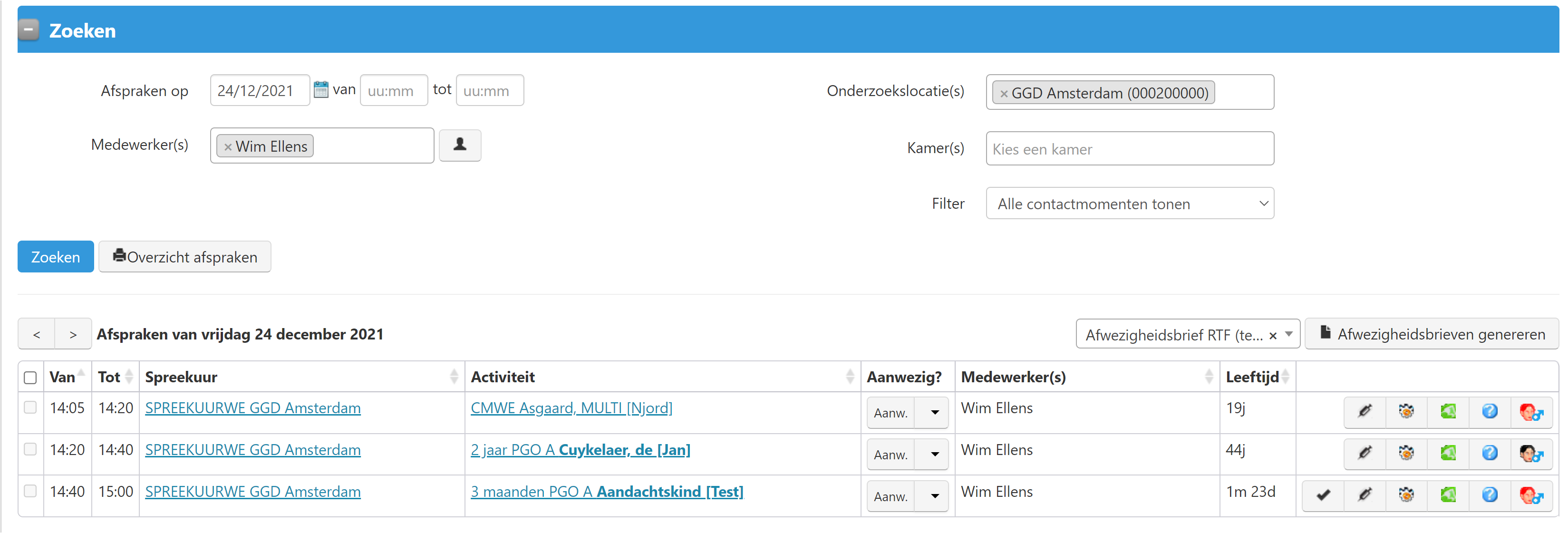 Met het veld ‘Medewerker’ kan worden gezocht op de afspraken in spreekuren van een of meerdere