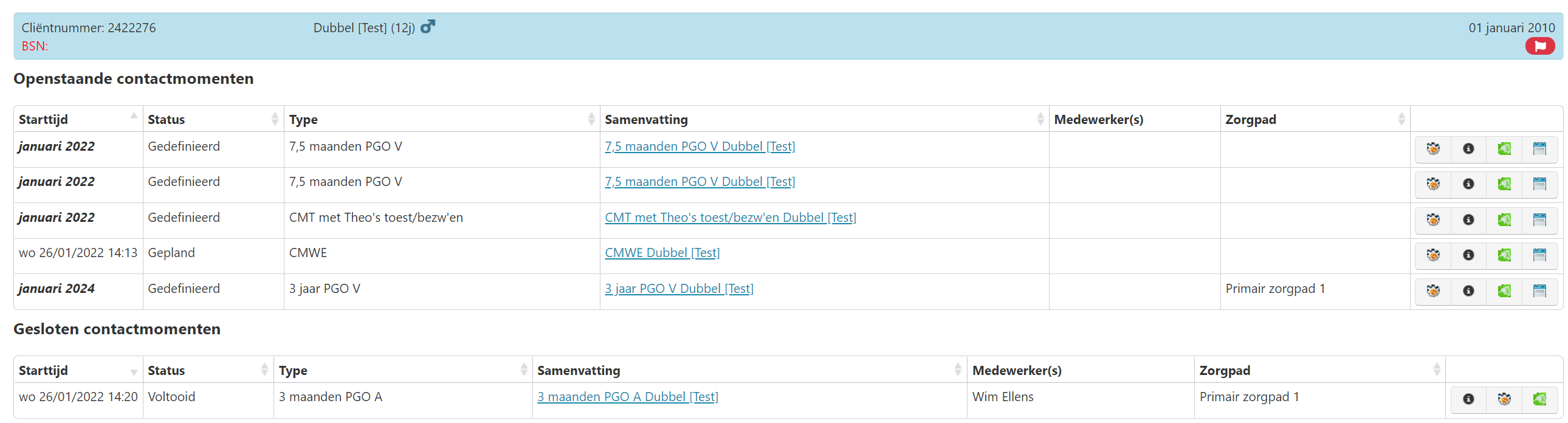 • Via de icoontjes: de planningsnotitie en aanvullende informatie (niet inhoudelijk). De planningsnotitie geldt voor alle te maken afspraken en zie je dus bij alle contactmomenten terug. Aanvullende informatie kan per contactmoment verschillen.