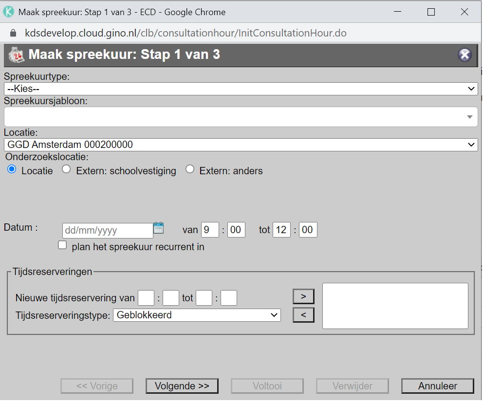 Je kunt in onderstand scherm nieuwe spreekuren aanmaken.Een spreekuur kun je zowel op een JGZ locatie als op externe locatie plannen. Een externe locatie kan een school zijn maar ook een andere locatie/gebouw. Bij het aanmaken van een nieuw spreekuur geef je begin- en eindtijden aan, kun je tijdsreserveringen opgeven waarop niet gepland mag worden en kun je medewerkers koppelen aan een spreekuur. Het is ook mogelijk om meerdere spreekuren tegelijk aan te maken (recurrent inplannen).