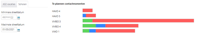 Aan het roodgekleurde deel van het staafdiagram kun je zien hoeveel contactmomenten er al ingepland hadden moeten zijn. Contactmomenten waarvan de streefdatum ligt vóór 14 dagen na vandaag worden meegeteld voor het rode vlak. Op 1 maart worden dus alle contactmomenten met een streefdatum voor 15 maart meegerekend.