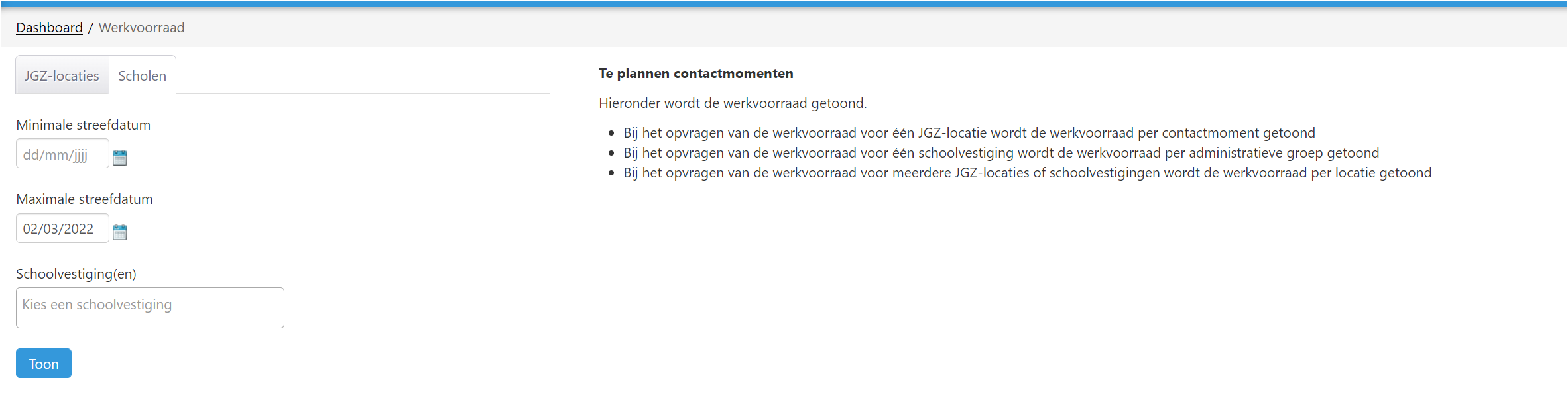 Je selecteert de schoolvestiging(en) waarvan je de werkvoorraad wilt zien. Daarnaast geef je aan in welke periode de streefdatum van de getelde contactmomenten moet liggen. De minimale streefdatum is standaard leeg; dit betekent dat alle contactmomenten met een streefdatum in het verleden in de werkvoorraad getoond zullen worden. De maximale streefdatum is standaard gevuld met de 6 weken na vandaag. Dit betekent dat alle contactmomenten met een streefdatum tot en met 6 weken na vandaag in de werkvoorraad getoond zullen worden.