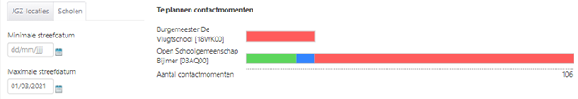Om inzicht te krijgen in de in te plannen contactmomenten die op een schoolvestiging worden uitgevoerd ga je naar het tabblad Scholen.