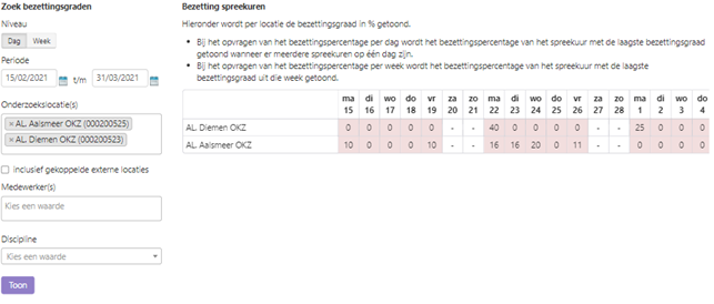 Indien er op een locatie meerdere spreekuren per dag of per week worden gehouden, wordt het percentage van het spreekuur met het laagste bezettingsgraad getoond. Dat wordt gedaan omdat het belangrijk is dat laag bezette spreekuren opgemerkt worden. Als je de gemiddelde bezetting zou tonen, zou je een slecht gevuld spreekuur niet zien als de rest van de spreekuren op die dag of in die week 100% gevuld is.