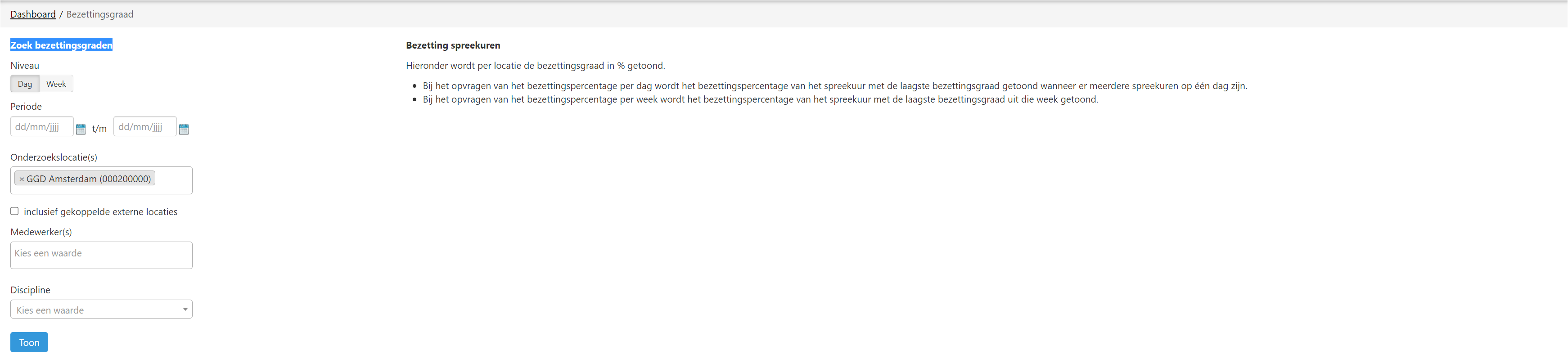 Het is ook mogelijk de bezettingsgraad op te vragen voor spreekuren waarbij één van de geselecteerde medewerkers deelnemer is. Je kunt de bezettingsgraad raadplegen voor spreekuren op een of meer locaties (de geselecteerde medewerker moet wel een spreekuur op een geselecteerde locatie hebben). Het selecteren van minimaal één locatie of medewerker is verplicht.